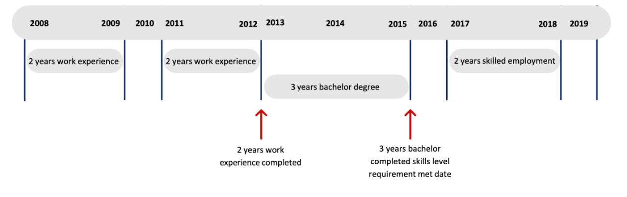The ACS assessment process will seek to find the earliest Skill Level Requirement Met Date possible for each assessment pathway. The Skill Level Requirement Met Date is dependent on the completion of both the relevant qualification and relevant work experience. If an applicant’s work experience is completed before the completion date of their qualification, the Skill Level Requirement Met Date will be determined by the earliest date that both the relevant work experience and the qualification are completed.